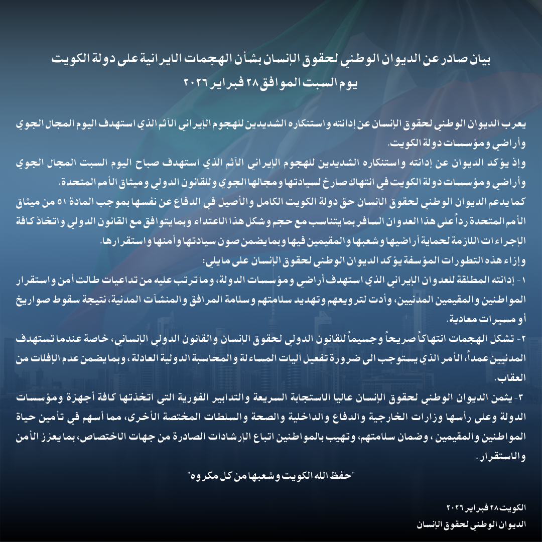 بيان صادر عن الديوان الوطني لحقوق الإنسان بشأن الهجمات الايرانية على دولة الكويت